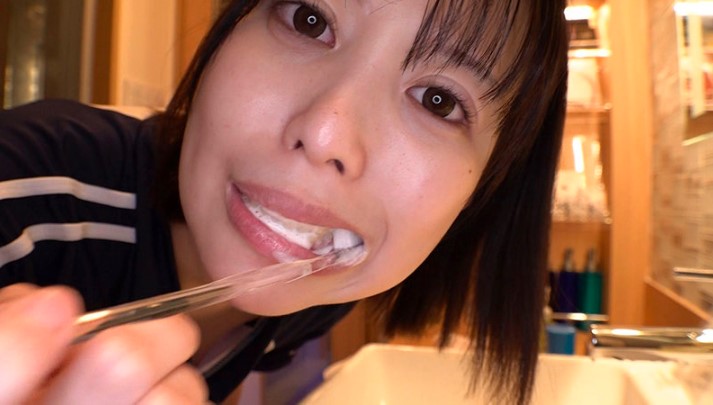 「全部落としちゃおうかなぁ…恥ずかしいやっぱり…」洗面所でメイクを落とし歯磨きするヘソ出しブルマコスプレ姿の天馬ゆい!